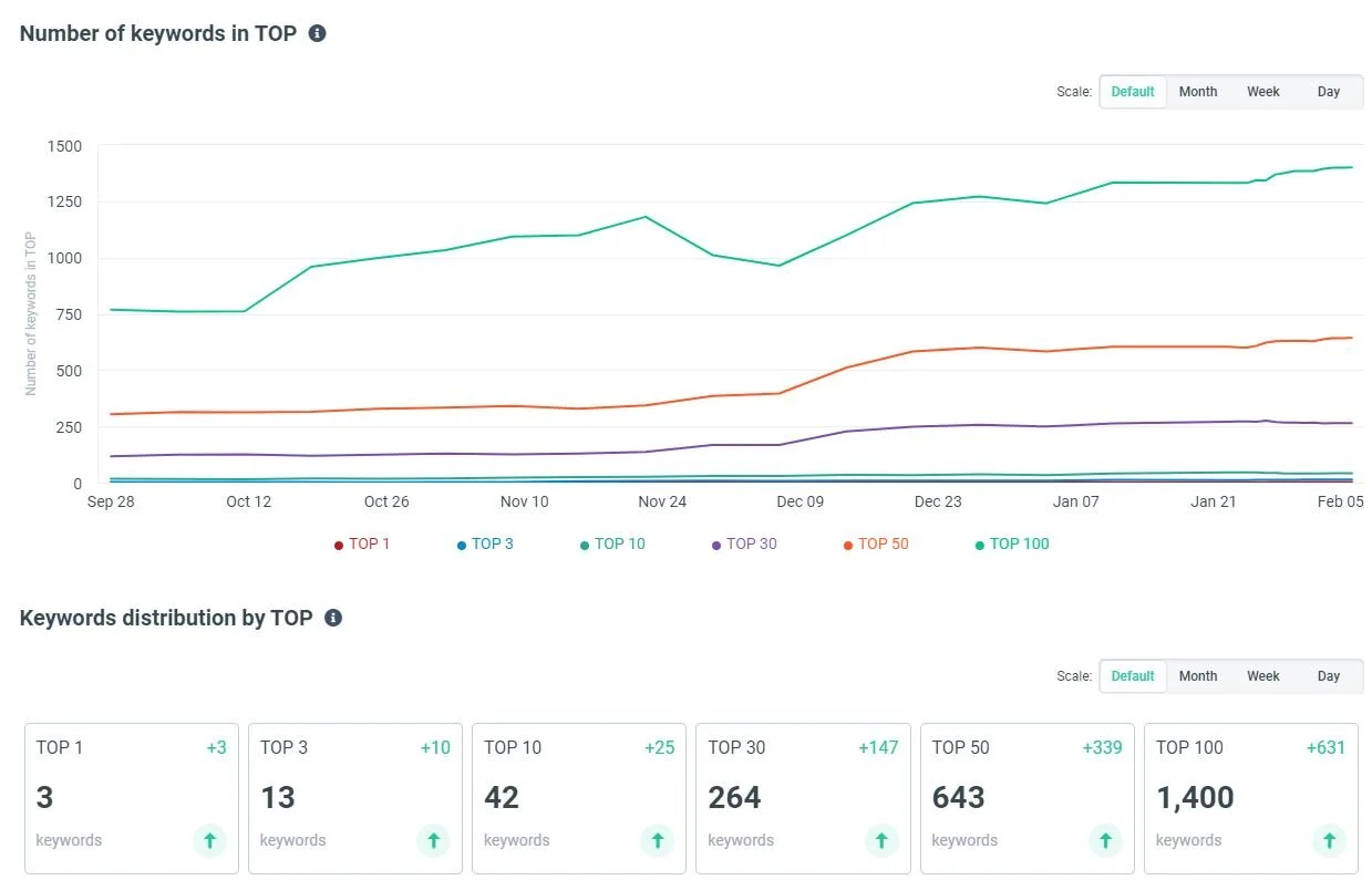 Mashreq's Website has followed a remarkable SEO increase and has more than 1400 keywords that rank on the top of the search results on the search engines. From 769 keywords ranking on TOP of the first 10 pages on Google in September 2020 to 1,400 keywords in February 2021.