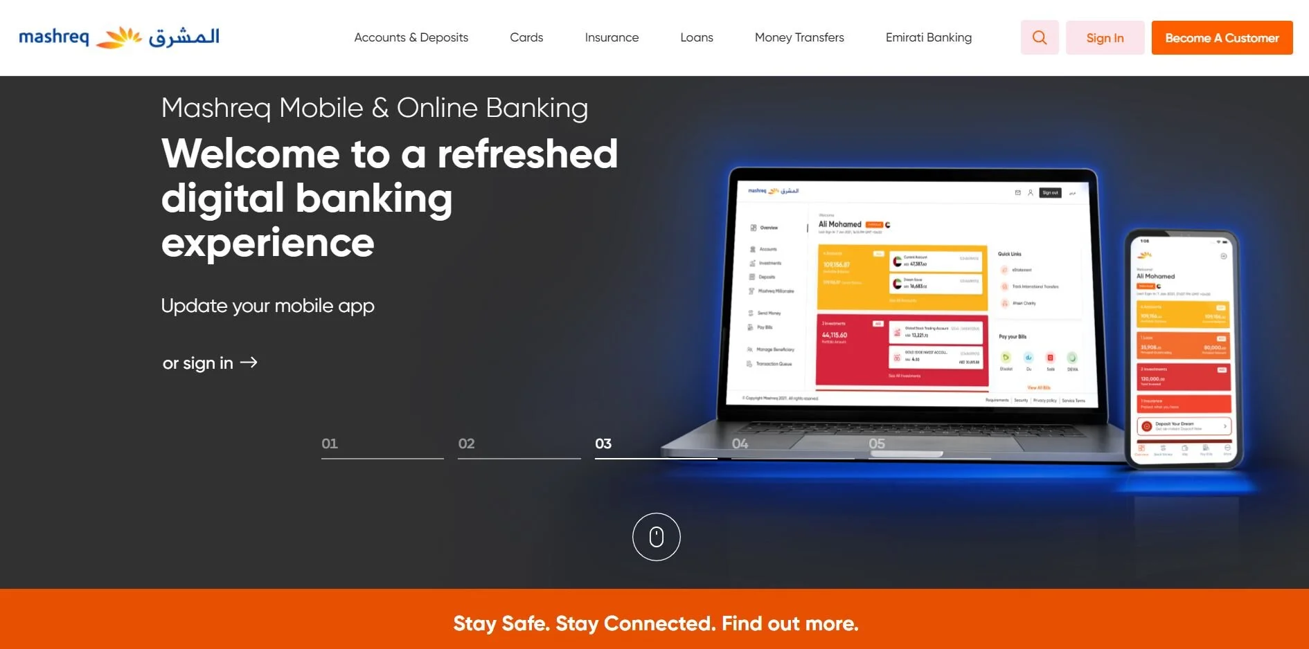 If you visit Mashreq’s website www.mashreqbank.com you can clearly experience fast and easy navigation, developed with a compelling design and clean interface, allowing people to browse the services and solutions with a great user experience.